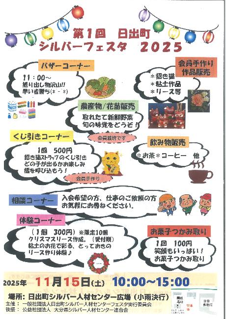 11月15日(土)当センター前広場にてシルバーフェスタを開催します。日出町シルバー人材センターの活動PRと会員募集ほか、会員手作り作品の展示販売、農作物や花苗、バザー、飲み物販売、お菓子のつかみ取りなど楽しいブースを用意。特に会員手作り招き猫ストラップが付いたくじ引き、クレイアートを使ったXmasリース作りはとっておきの体験となります。シルバーを知ってる方も知らない方も、ぜひ遊びにきてください!(開始10:00~15:00まで 少雨決行) チラシ→